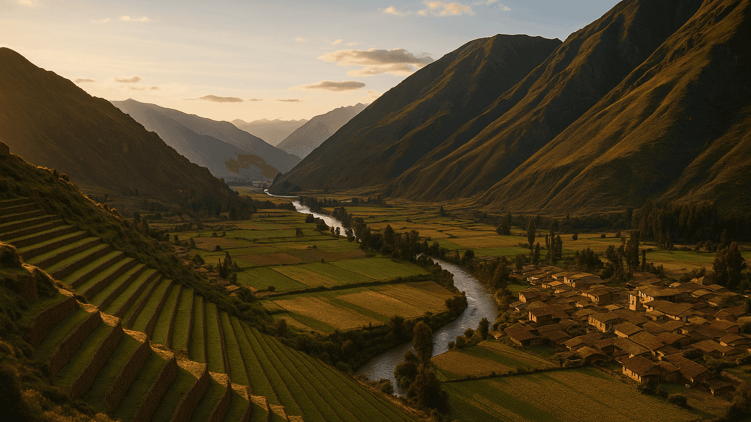 - Campos de maíz y quinua que pintan el valle con tonos verdes y dorados.